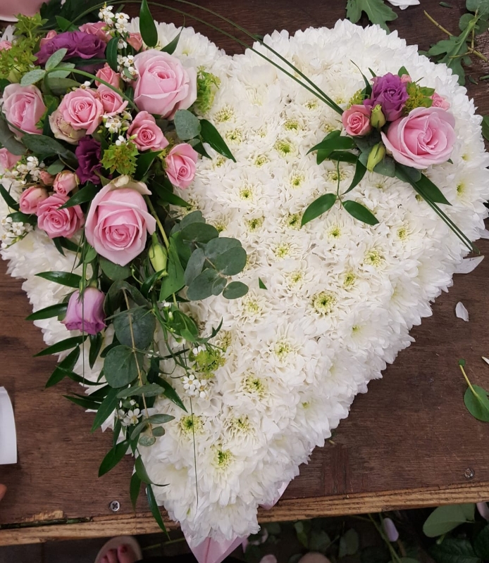 A classic heart shaped funeral tribute, based in flowers (typically chrysanthemums) for a clean and elegant finish. Available with your choice of ribbon or natural foliage edging and featuring a spray of seasonal flowers in the colour palette of your choice.