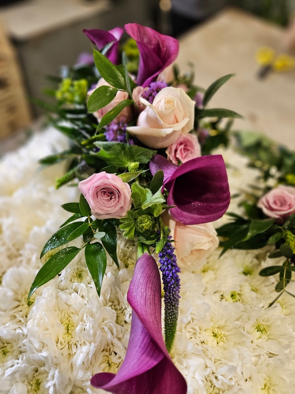 A soft and elegant funeral tribute, symbolising comfort and peace. This cushion shaped design is covered with a neat layer of basing (chrysanthemum) and finished with a natural foliage edge for a softer, more elegant feel. A coordinating spray of seasonal blooms in your chosen colours is added to one corner for a personalised touch.
