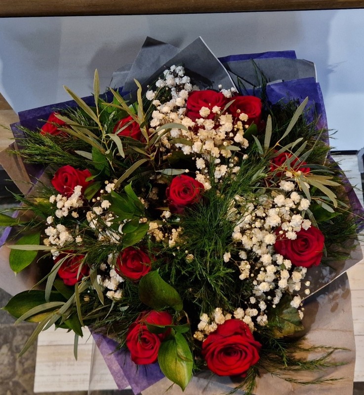 A simple and timeless bouquet of 12 roses in the colour of your choice, beautifully arranged with complimentary foliage.
